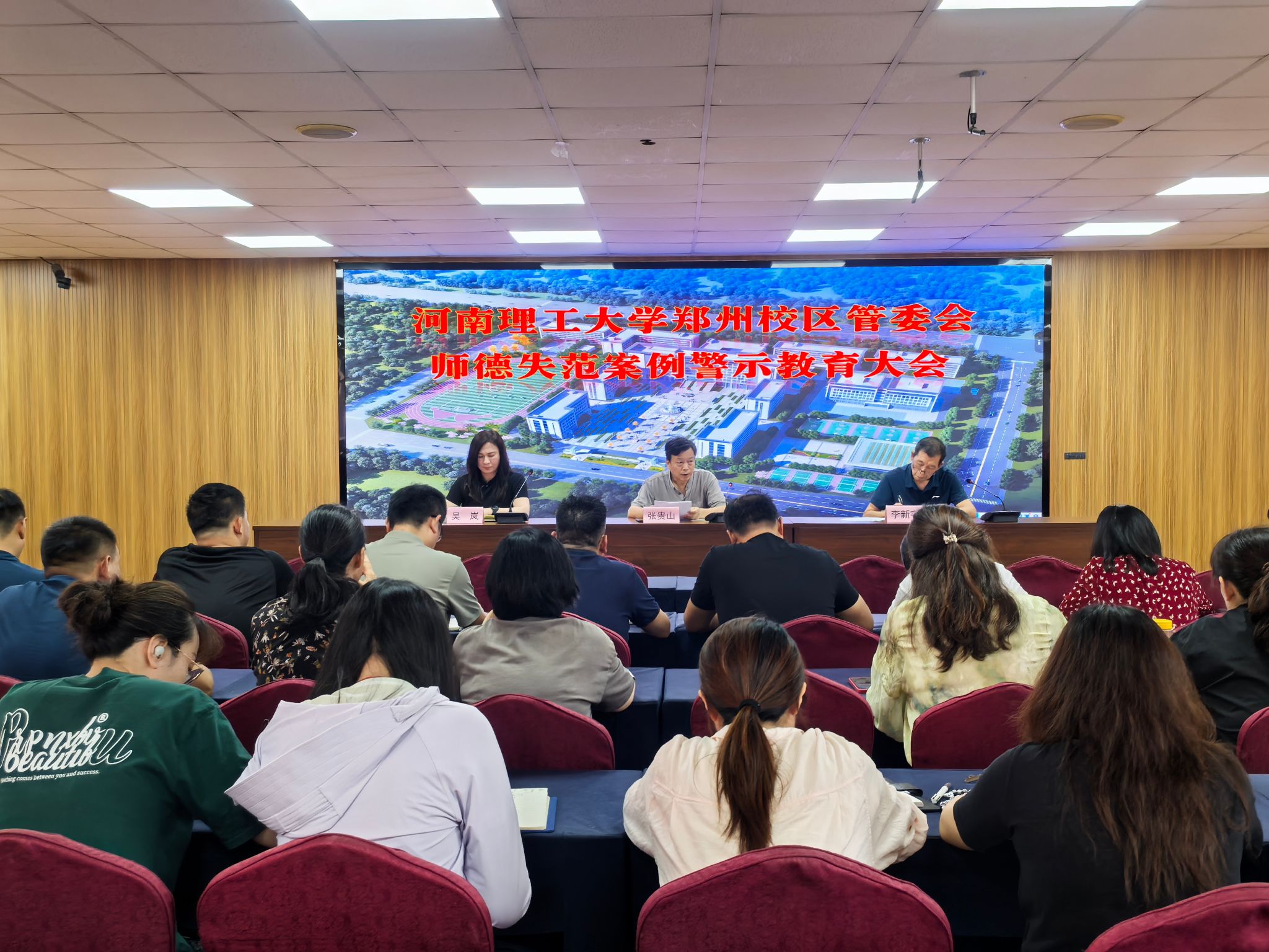 为深入贯彻中央八项规定精神学习教育,积极响应学校关于开展师德失范案例警示教育活动的部署要求,进一步强化师德师风建设与管理监督,7月7日,郑州校区管委会组织全体教职工召开师德失范案例警示教育大会。
