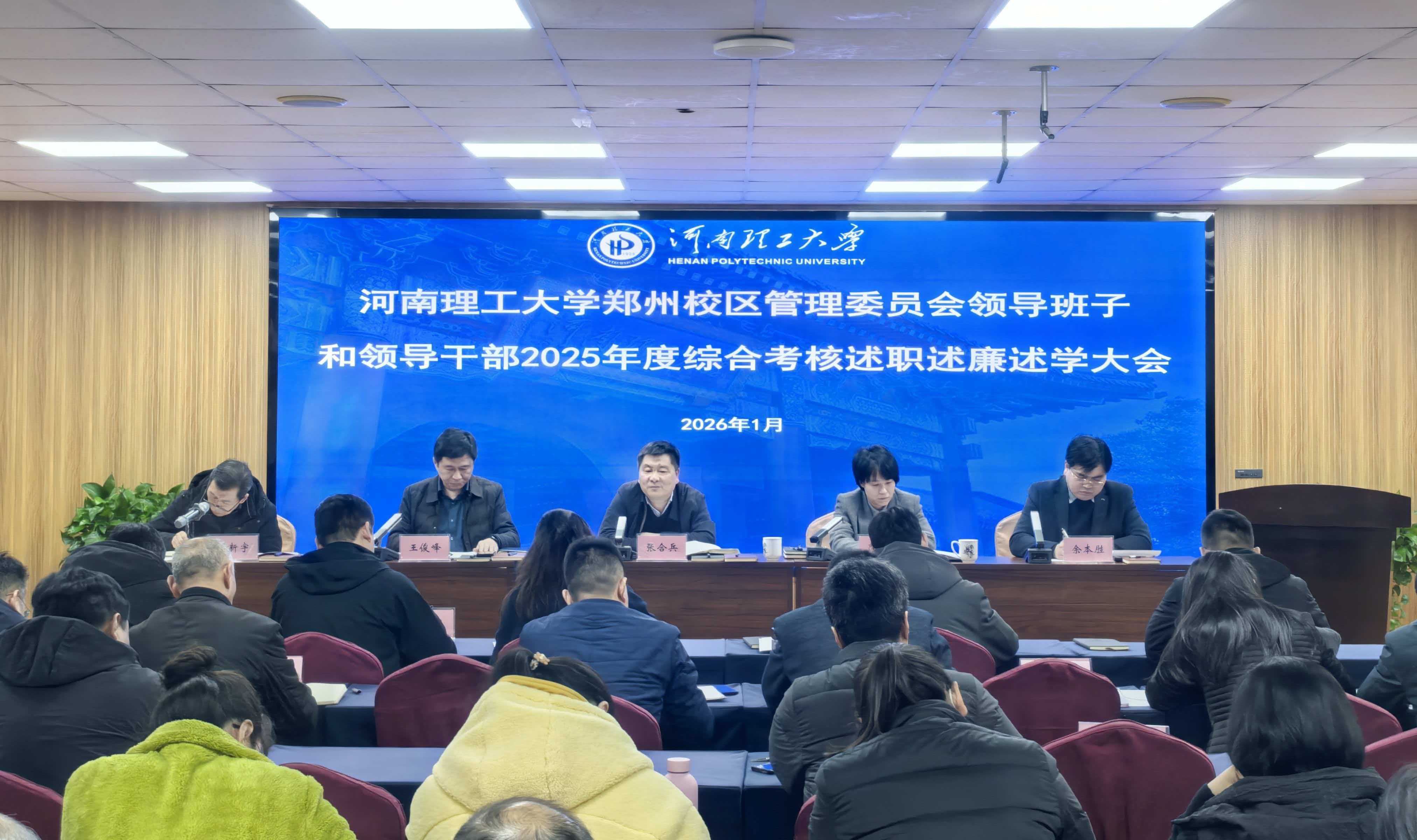 2026年1月14日下午,郑州校区管委会召开领导班子和领导干部2025年度考核述职述廉述学大会。副校长张合兵出席会议,管委会全体教职工参加会议,会议由管委会副主任李新宇主持。