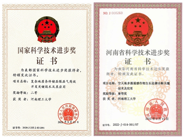 2021年,曹运兴教授主持的“复杂地质条件储层煤气高效开发关键技术及其应用”获得国家科技进步奖二等奖。这是自2012年以来,学校作为第一完成单位再次获得国家级科技奖励,也是当年度河南省内作为第一完成单位获得的唯一一项国家科技进步奖。2021年,王树仁教授主持的“采动围岩压力拱与拱内铰接岩梁承载机制及控制技术”项目获得河南省科技进步一等奖。这是自2012年以来,学校作为第一完成单位再次获得省政府一等奖。2022年,学校以第一完成单位获得河南省科技进步奖一等奖2项。两年时间,以第一完成单位获得1项国家科技进步奖、3项河南省科技进步奖一等奖,创造了学校科技成果奖励的历史性辉煌。