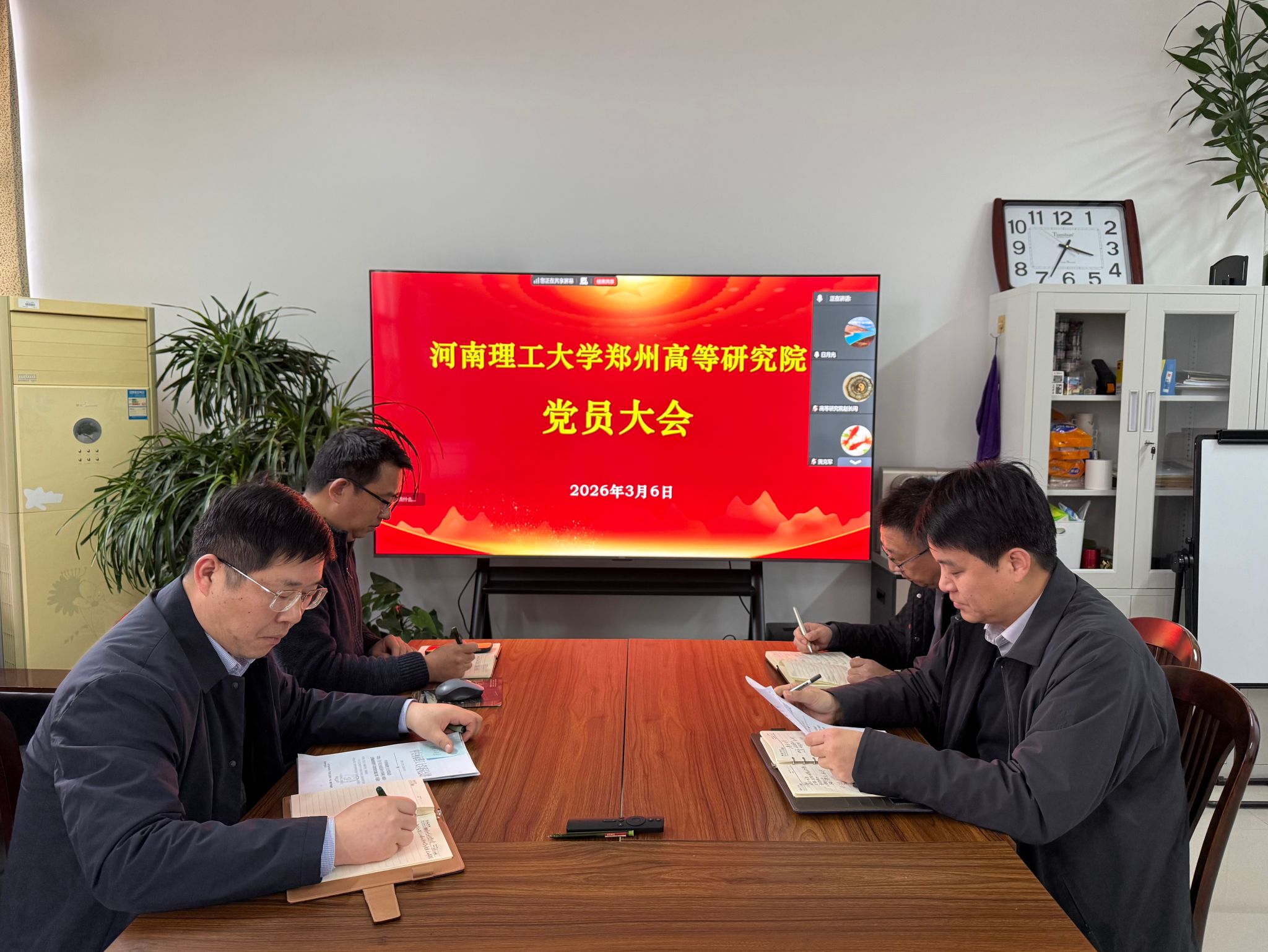 3月6日下午,郑州高等研究院召开全体党员大会,深入学习贯彻习近平总书记关于树立和践行正确政绩观学习教育的重要讲话精神,传达贯彻落实上级有关通知和会议精神,研究部署郑研院树立和践行正确政绩观学习教育(以下简称“学习教育”)工作。副院长杨明主持会议并讲话,副院长曹建亮传达学校学习教育工作方案,郑研院全体党员以线下线上相结合的方式参加会议。