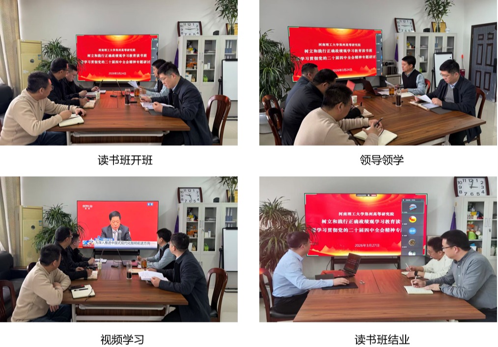 3月24日至27日,郑州高等研究院以线上线下相结合方式举办树立和践行正确政绩观学习教育读书班暨学习贯彻党的二十届四中全会精神专题读书班。副院长杨明主持召开学习教育专题研讨会,全体处级、科级及以下干部、党员参加学习。