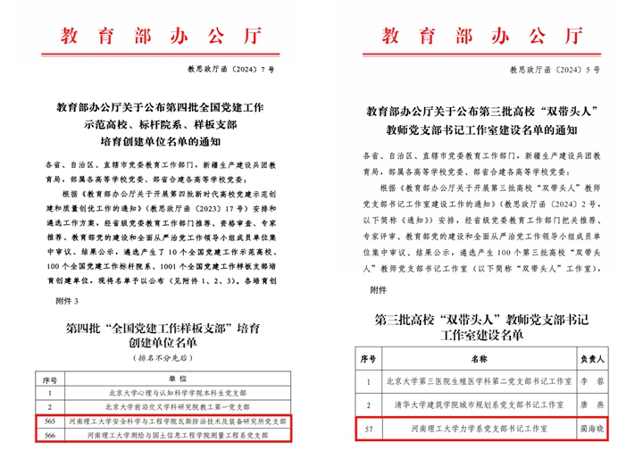 本网讯(通讯员 梁心愿)近日,教育部办公厅公布了第四批全国党建工作样板支部培育创建单位名单和第三批全国高校“双带头人”教师党支部书记工作室建设名单,学校安全学院瓦斯防治技术及装备研究所党支部、测绘学院测量工程系党支部等2个党支部入选第四批“全国党建工作样板支部”培育创建单位;学校土木学院力学系党支部作为河南省高校唯一基层党组织入选第三批全国高校“双带头人”教师党支部书记工作室(全国高校仅100个党支部入选),取得学校在该项荣誉的首次突破。