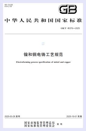 国家标准GB/T 45376—2025《镍和铜电铸工艺规范》规定了镍和铜制品的电铸工艺流程、芯模制备、芯模预处理、电铸过程控制与电铸后处理等环节的操作要求,并描述了电铸制品的质量检测方法。电铸是利用阴极电化学沉积原理制造结构或零件的特种加工方法,具有成形精度高、适用材料与几何形状范围广、表面形态-形状-性能可协同调控等优势,主要用于其他方法难以或不能制造的特殊形状金属结构与零件,如精细表面结构、光滑内表面、薄壁多孔件、大型薄壳体等。电铸技术在表面微结构模具、金属反射镜、航空航天薄壳构件(如火箭喷气管、波导/纹管、冷屏件等)、光滑内壁金属管、微纳尺度金属零件、金属掩模板/转印板等领域具有不可替代的优势,现已成为半导体制造、航空航天、模具、磨具、医疗器械、精密机械等产业不可或缺的支撑技术之一。近年来,受新一代信息技术、国防军工、高端医疗器械等国家战略需求驱动,电铸技术的基础研究与推广应用日趋活跃。