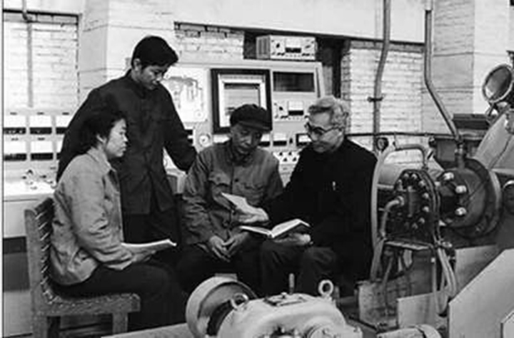 在工厂实验室与同事们工作的傅恒志