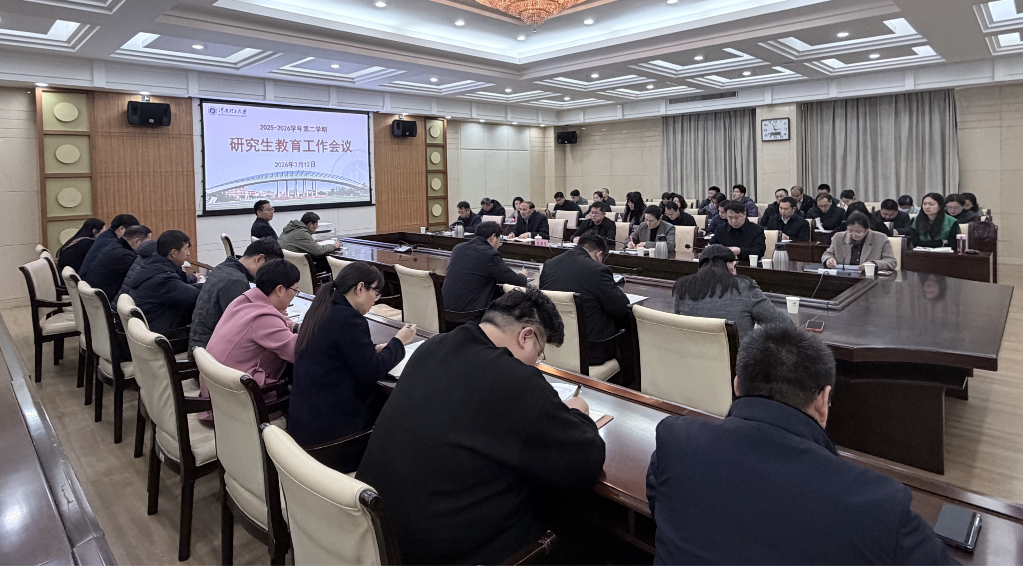 本网讯 近日,学校2026年春季学期研究生教育工作会议在力行楼方形会议室召开。副校长边亚东出席会议,各学院主管研究生工作的副院长、研究生管理办公室主任(秘书)和研究生院全体人员参加会议,会议由研究生院院长陈俊杰主持。
