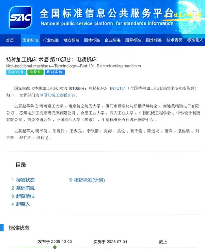 本网讯(通讯员 李欣潮)12月2日,国家市场监督管理总局、国家标准化管理委员会发布了国家标准《特种加工机床 术语 第10部分:电铸机床》(GB/T 14896.10-2025)。该标准是我校牵头组织南京航空航天大学、中德标准化合作苏州创新中心、苏州电加工机床研究所有限公司 、合肥工业大学、西安交通大学等12家单位共同研制的我国电铸领域的第二个国家标准。标准界定了电铸机床的加工方法、名称、工艺参数和主要零部件的术语,是我国首个电铸机床基本术语标准,其发布与实施对规范电铸制造行业的术语及其概念、实现信息传递的精确性和唯一性具有重要意义,同时有利于促进了不同学科和行业之间的技术交流与合作,为科学研究、工程建设和国际贸易提供了通用语言。