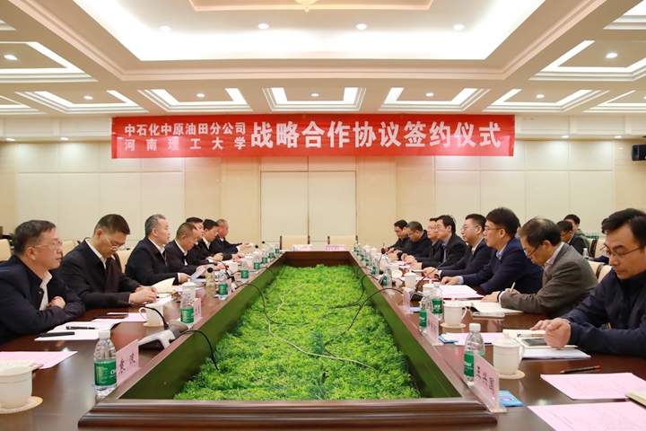 本网讯(通讯员 王兴国/文 韦东星/图)3月21日,为进一步加强校企合作,推动科技成果和产业发展深度融合,中石化中原油田分公司与河南理工大学战略合作协议在焦作签署。中原油田勘探局有限公司执行董事、党委书记、分公司代表张庆生,勘探局有限公司党委常委、分公司副总经理、总地质师段金宝,校长赵同谦,学术副校长金双根等出席座谈会及签约仪式。会议由副校长李振华主持。
