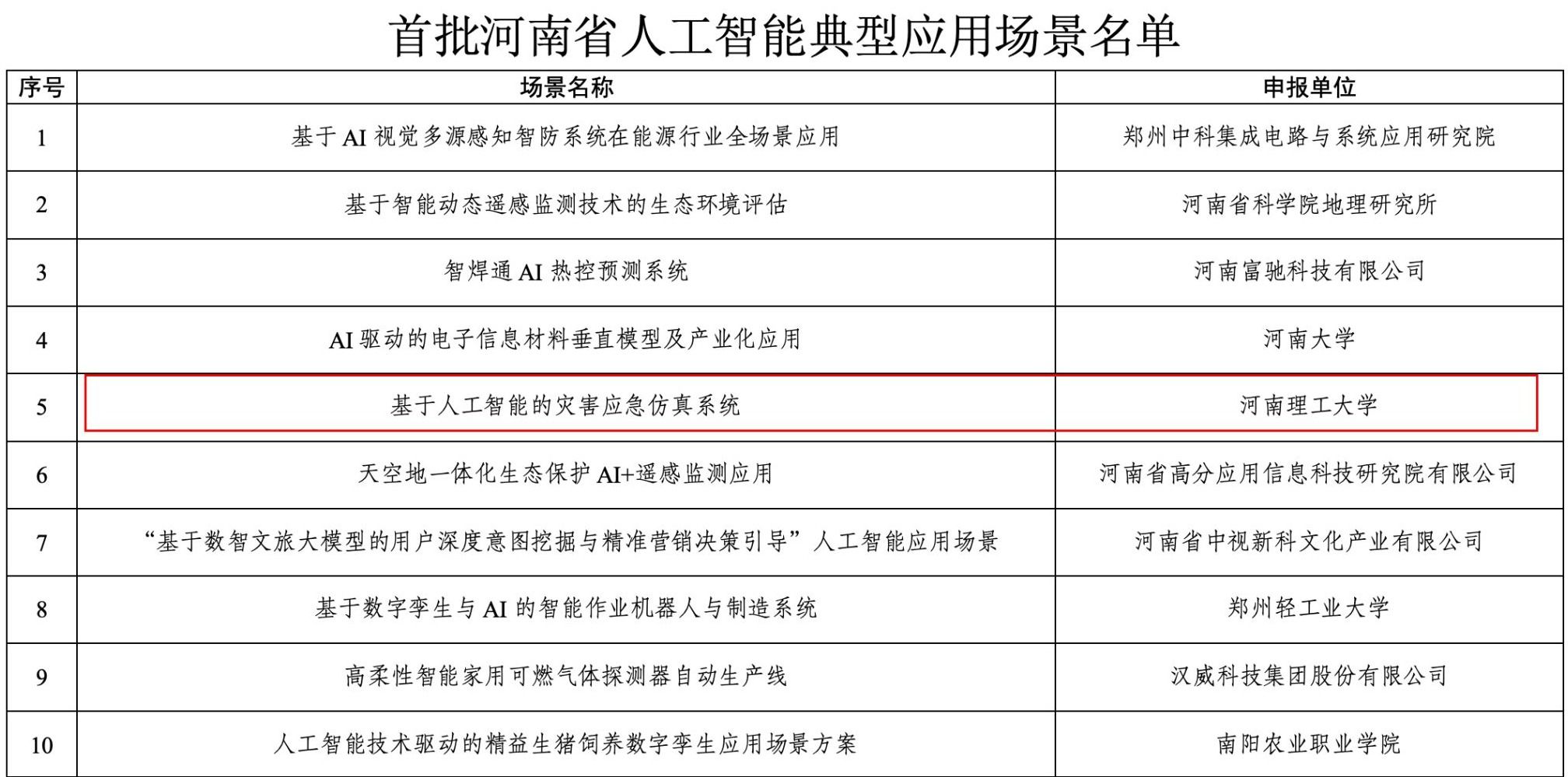 本网讯(通讯员 任建吉)近日,省发展改革委发布首批河南省人工智能行业赋能中心及人工智能典型应用场景名单。其中“首批河南省人工智能典型应用场景”共立项53项,我校申报的“基于人工智能的灾害应急仿真系统”获批。