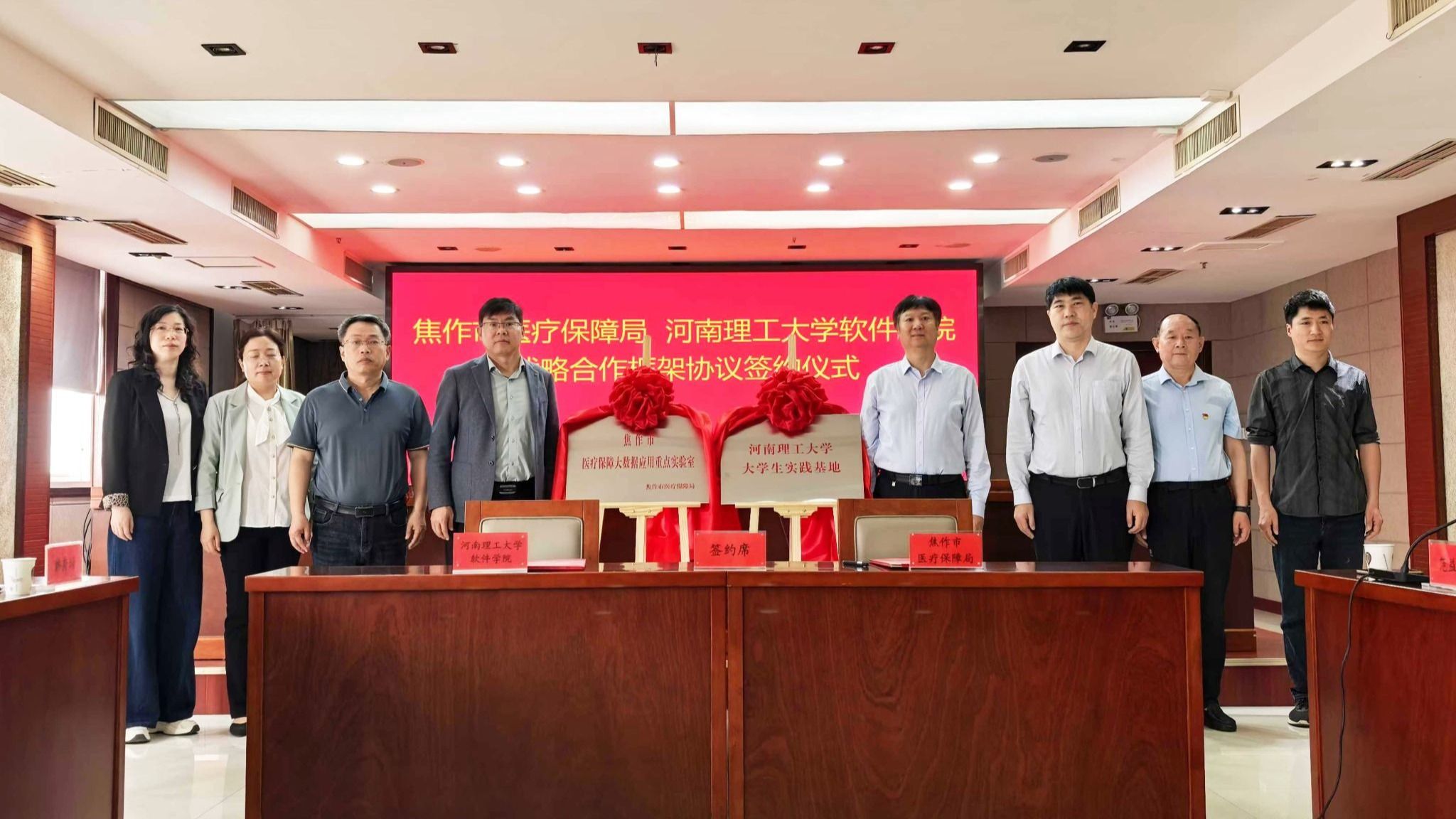 本网讯(通讯员 韩秀娟)4月23日,软件学院与焦作市医疗保障局(以下简称“市医保局”)战略合作协议签约暨“软件学院大学生实践基地”“焦作市医疗保障大数据应用重点实验室”揭牌仪式在市医保局举行。市医保局局长赵国强、副局长范益智,软件学院相关领导等出席仪式。
